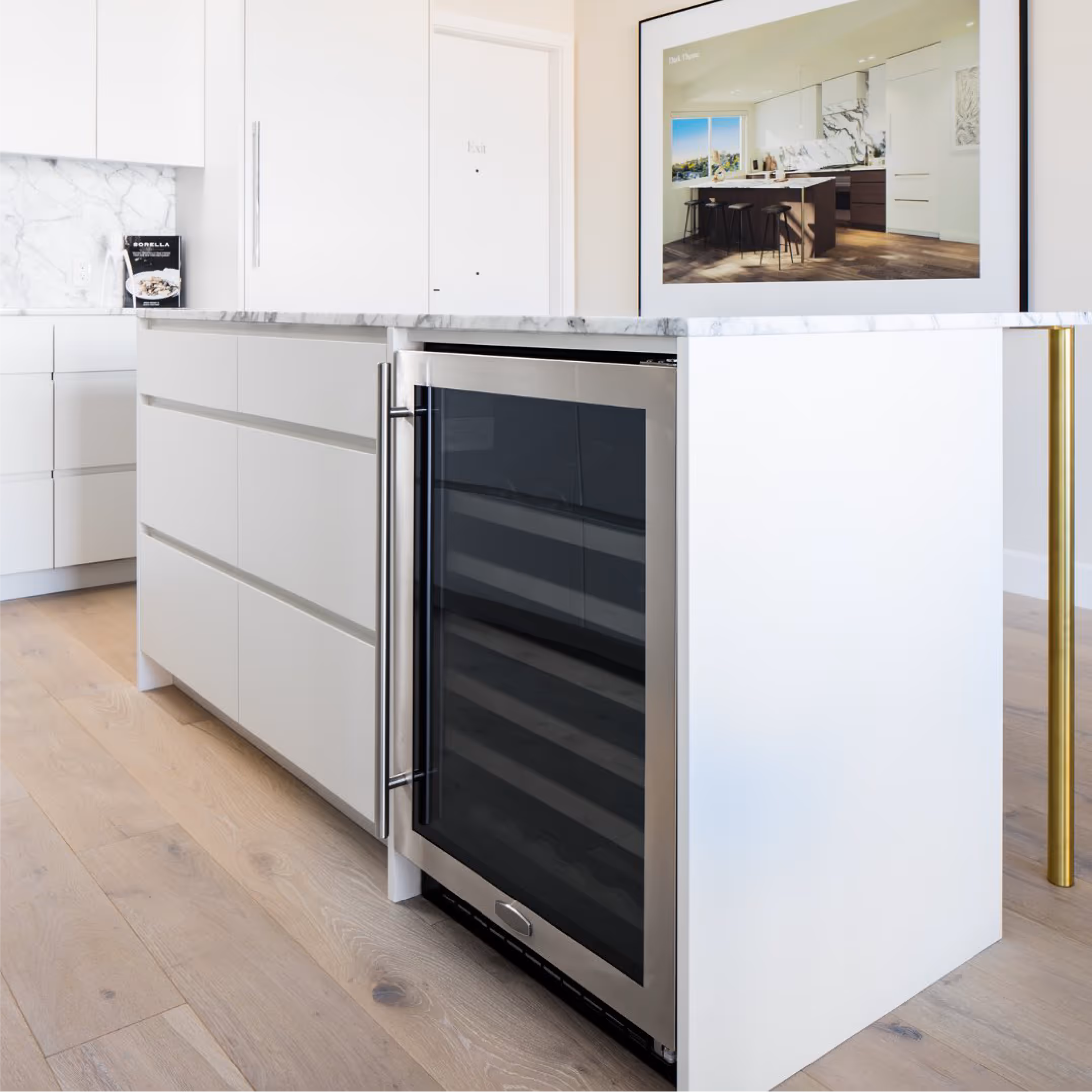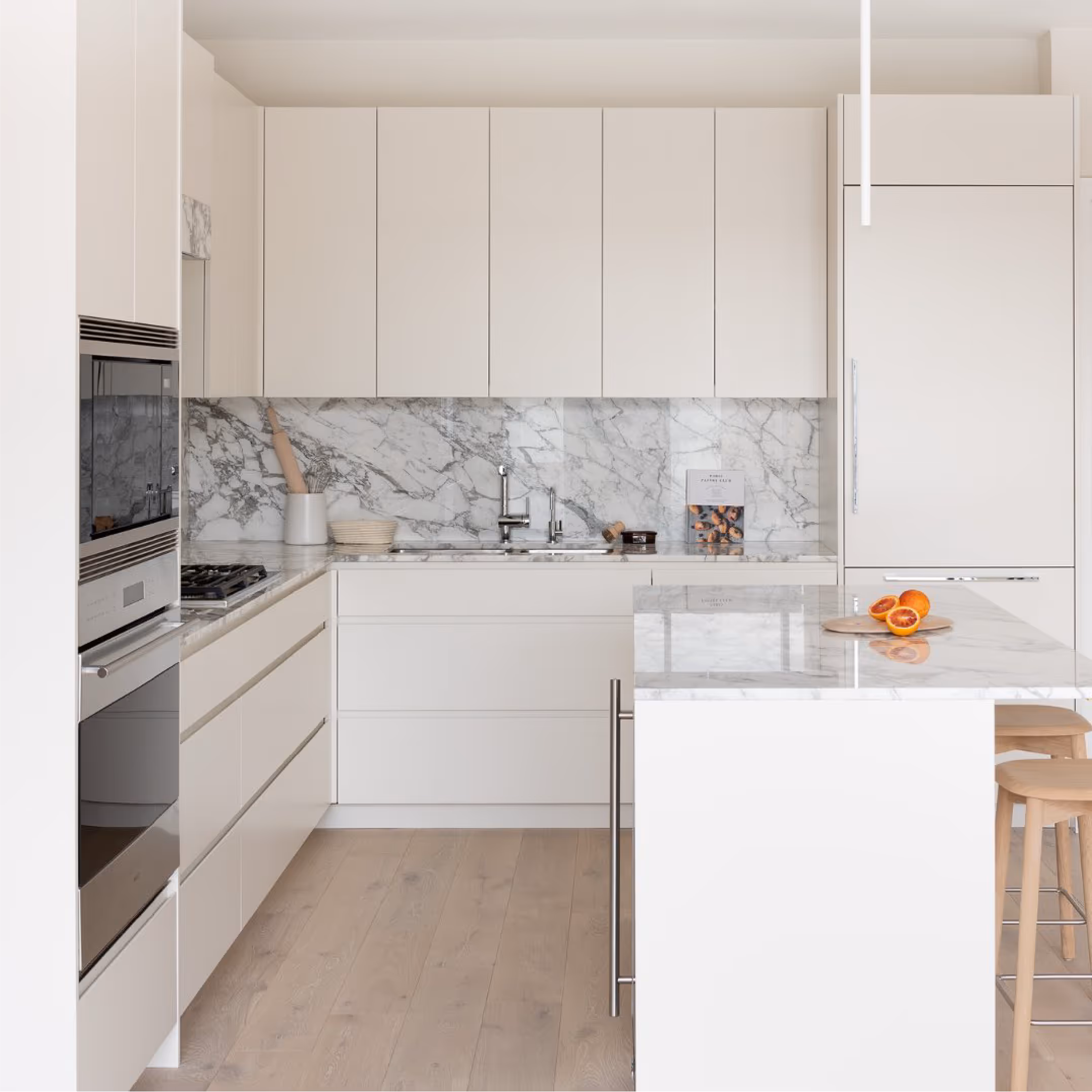 The building’s striking marble façade immediately sets it apart — a sculptural composition of clean lines and rich materials that evokes classical European design while embracing the natural light and landscape of the Pacific Northwest. Inside, Ste. Marie Design Studio extends this language into a series of interiors that balance softness, precision, and a quiet sense of luxury.