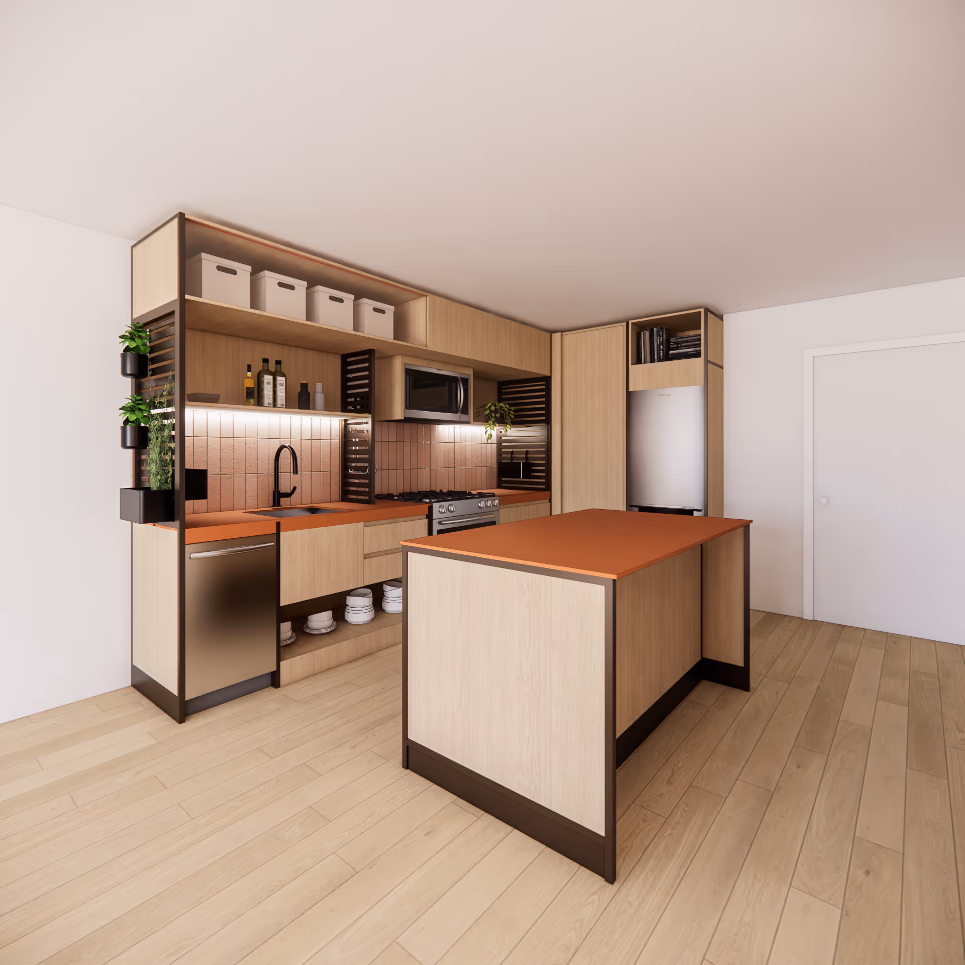 Kitspace’s interior design strategy, titled Tropical Brutalism meets Mexican Modernism, channels the warmth of Texas sunlight, the textures of desert soil and river stone, and the timeless simplicity of Barragán-inspired colour and form. The design framework expresses: